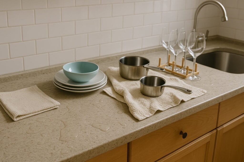 Messy kitchen countertop with wet cloth mats and puddles